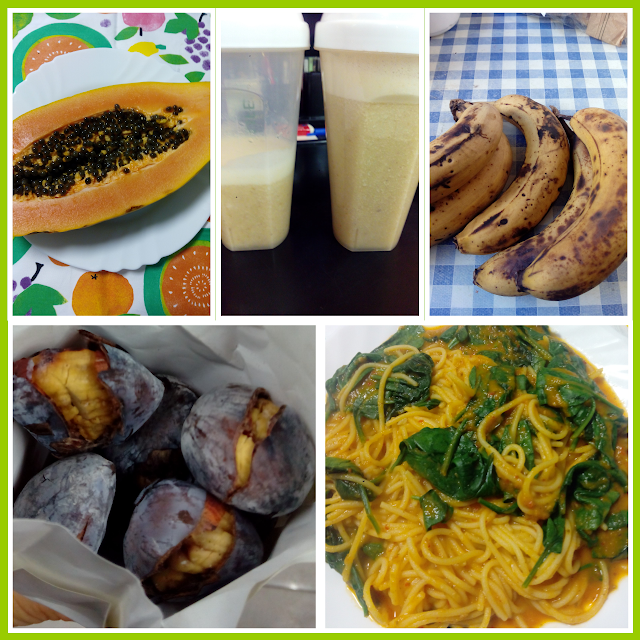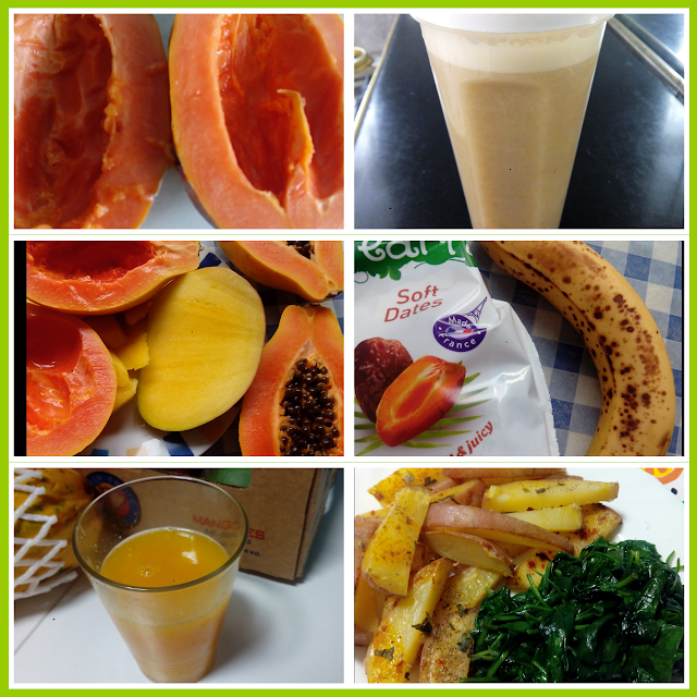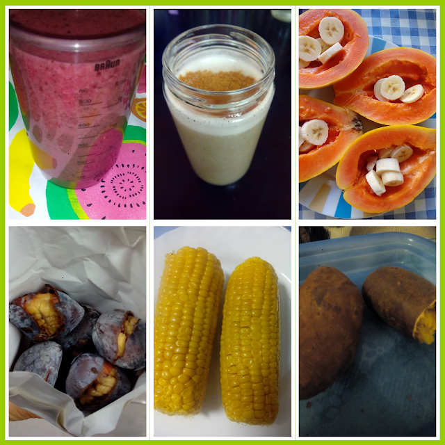 Comecei o dia com uma papaia por volta das 8h, às 10h30 fiz um batido com uma banana 6 tâmaras e água.