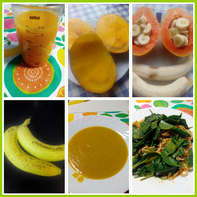 Comecei o dia com 500ml de sumo de laranja por volta das 7h30, às 11h comi uma manga mas a minha vontade era mesmo beber um café (contem com estas coisas que é normal) não tenho o habito de beber cafés a toda a hora, mas de manha sabia me bem e hoje com a dor de cabeça ainda mais. Ao 12h30 comi uma papaia e 3 bananas e meia hora depois bebi um chá. Às 16h lanchei 3 bananas e às 17h30 bebi um chá comi 2 biscoitos enquanto fazia companhia á minha filha (segunda é o único dia da semana que lanchamos juntas), ao jantar comi um prato cheio de sopa que tinha feita e outro de massa que tambem tinha feita à qual juntei molho de tomate e espinafres...fiquei satisfeita, hoje n vou atacar as bolachas :p